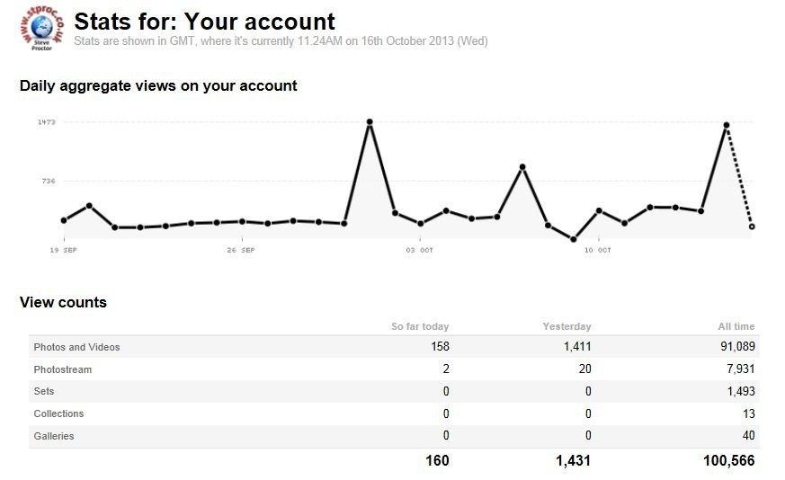 Today saw a landmark on my Flickr account with the total number of hits reaching the 100,000 mark. Average daily hits now seems to be in the region of 250-350 where just a year ago it was around 20-30 daily.