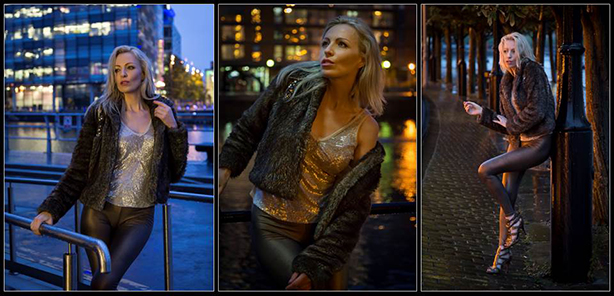 On a wet Friday night a small group of photographers worked with the energetic north-east model Zara Watson in the Salford Quays area of Manchester. Our objective was to put into practice some techniques for balancing ambient light with off-camera flash. This was certainly a challenge at times because of the rapidly changing natural light conditions allied to the omnipresent Manchester drizzle. Using anything other than the manual settings for shutter and aperture was risky and I saw that I quickly learned how to judge the lighting properties of a scene and adjust the camera to capture the image how I wanted to see it. White balance isn’t straightforward with the many different light sources around, but a quick adjustment in Photoshop or Lightroom can easily remedy this.
