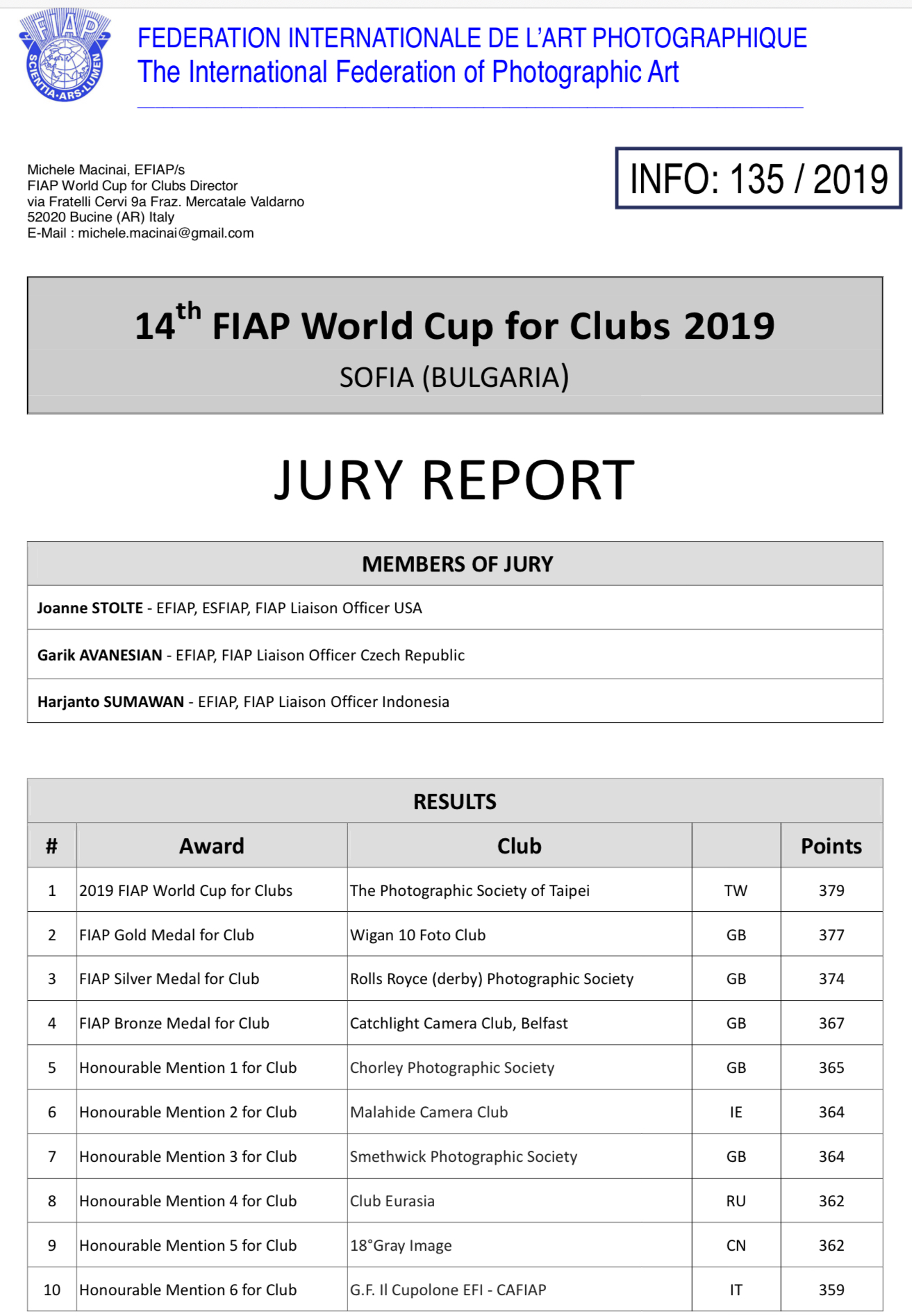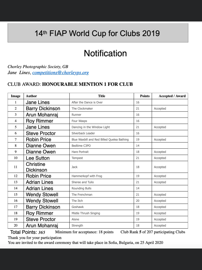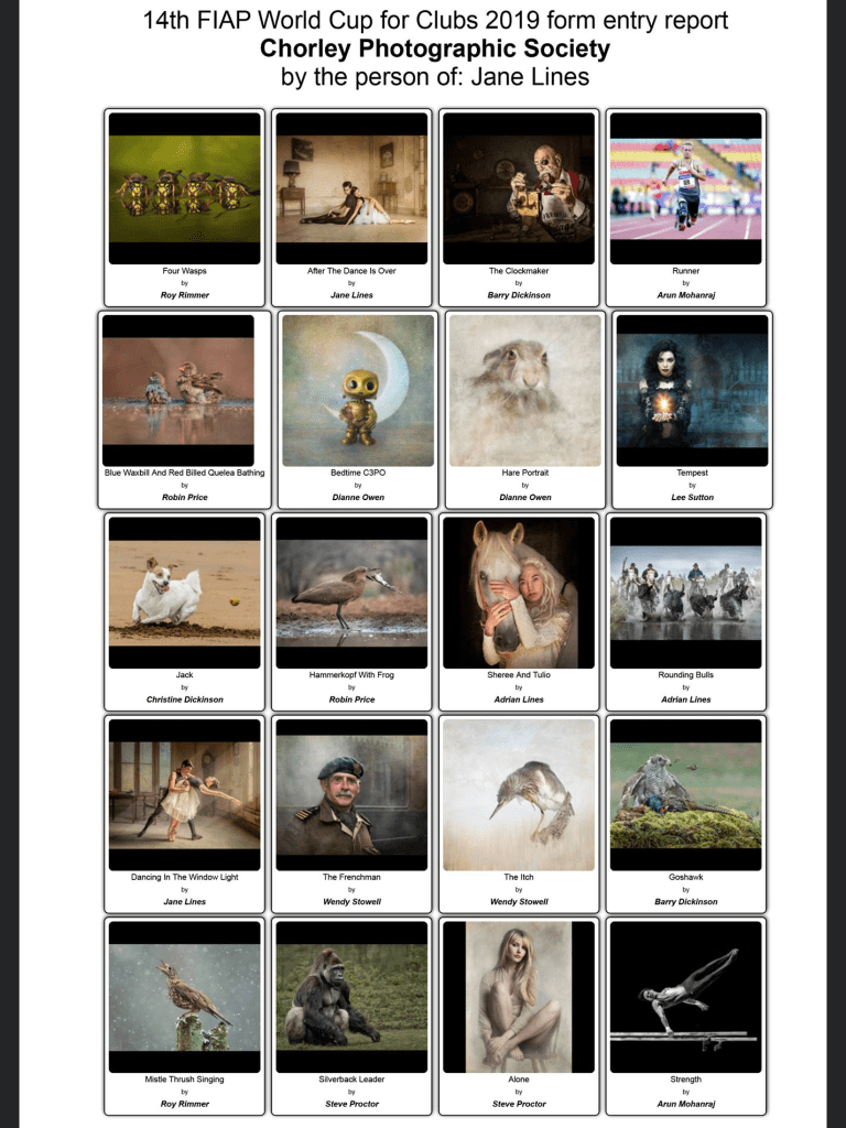 The results are out for the latest photographic World Cup. The competition was won by Taipei of Taiwan, but British clubs otherwise dominated the placings at the top of the leaderboard. Chorley Photographic Society finished a very creditable 5th place and I had a couple of entries in there, one of which was ‘accepted’. Other British clubs featured well too with many of current successful clubs claiming seven of the top ten places, a great indication of the strength of photography in the UK. Overall the marking appears to be lower than usual for some reason, the placings and Chorley’s images & scores are shown below.