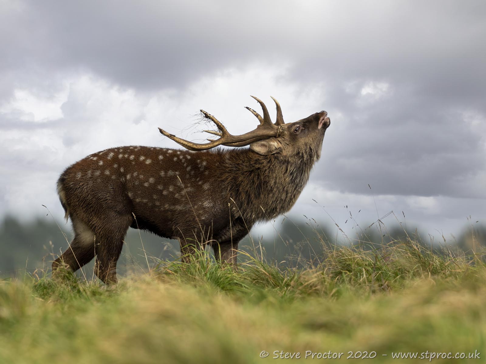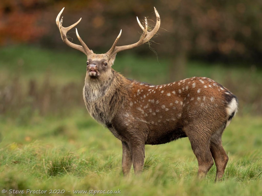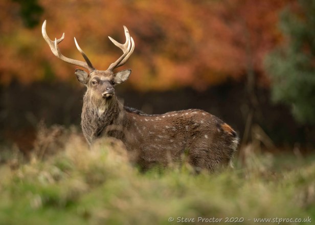 Sika deer are similar to Fallow deer in coat colour, they vary from pale yellow/brown through to red/brown with white spots in the summer months to dark grey and black in the winter. There is often a distinct dark coloured dorsal stripe running the length of the back.