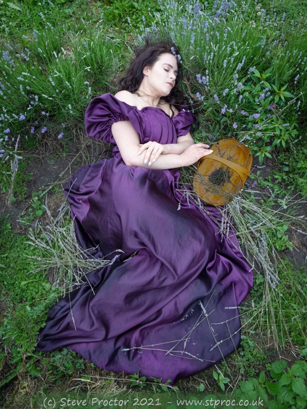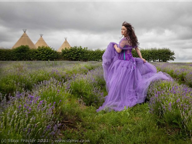 I joined two other photographers to do some photography amongst Lavender fields in the North West of England last week, on a day when we had a real mixture of (very) brief sunny spells and threatening dark clouds. Needless to say that the clouds won! Our subject for the day was ‘Silk’, a model from Wales who was outfitted by Tabitha Boydell in some fantastic gowns and props.