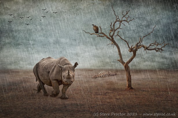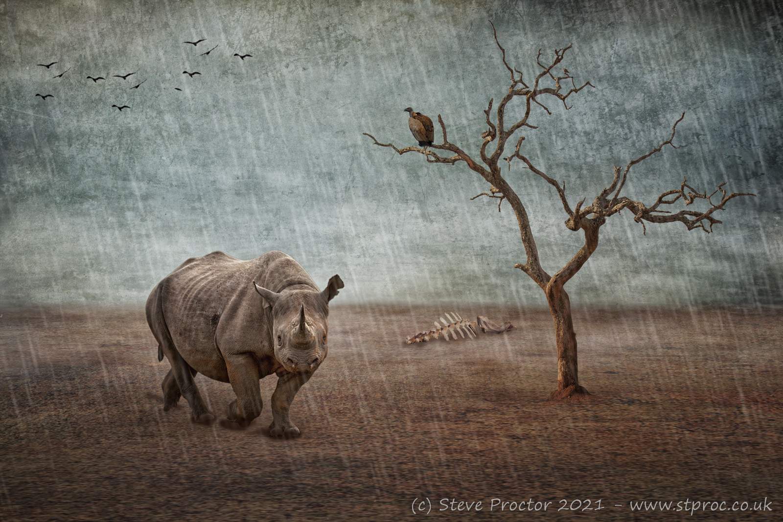 With this mind, and being a photographer, I wanted to create an image with a narrative that depicts what we are currently doing to planet Earth. The image below shows a Black Rhino taken in South Africa along with a dead tree and Vulture all placed in a desolate landscape. To finish it off I placed a carcass in the background to add to the sense of doom!