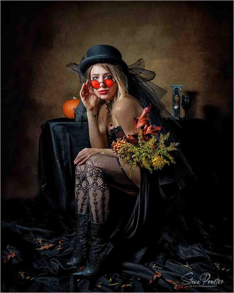 Another image that was shot in a church hall with Olga in front of a table with a few Halloween type artefacts, a black sheet draped down onto the floor and some dead flowers scattered about the place.