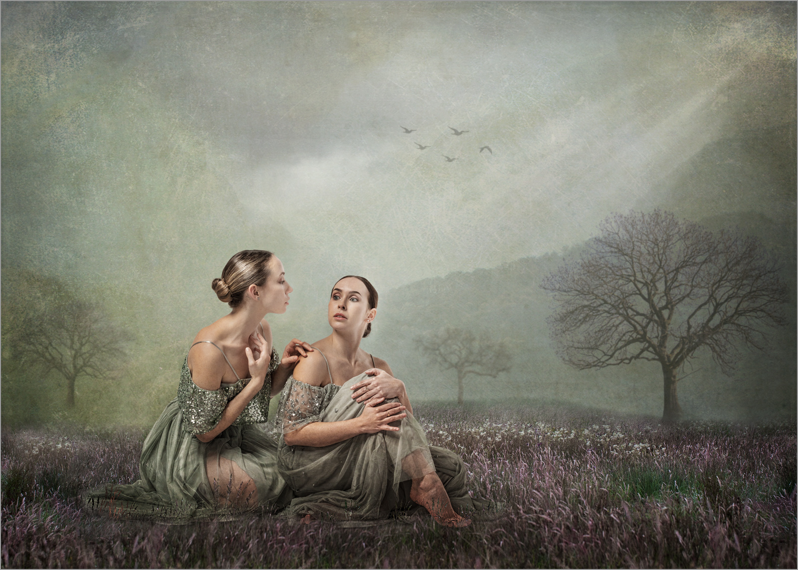 Creative photography transcends the boundaries of traditional image-making, inviting viewers into a world where imagination and technique converge. While the subjects were photographed in a controlled studio environment, the final composition is a blend of multiple scenic elements—rolling hills, leafless trees and a pastel-hued sky—stitched together to evoke a dreamlike narrative.